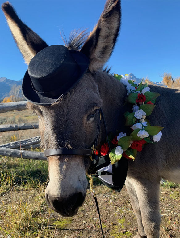 I'm Jasmine Scholes, and I'd like to share the heartwarming story of how "Black Tie Burro" came into existence. Our journey began with the unexpected loss of Charger, one of our dearest horses, in early December 2022. Hank, our other older horse, was deeply affected by this loss, feeling lonely and distressed without his best friend. Understanding that horses need companionship, I set out to find a suitable buddy for Hank. After contemplation, I turned to the idea of mini-donkeys. When my friends caught wind of my search, one of them came across an adorable mini-donkey nearby. On Christmas Day, December 25th, 2022, I met this little guy, Zeus, and the rest is history! Zeus became the healing presence we all needed, bringing laughter, joy, and a touch of excitement to our lives. He adores being the center of attention.